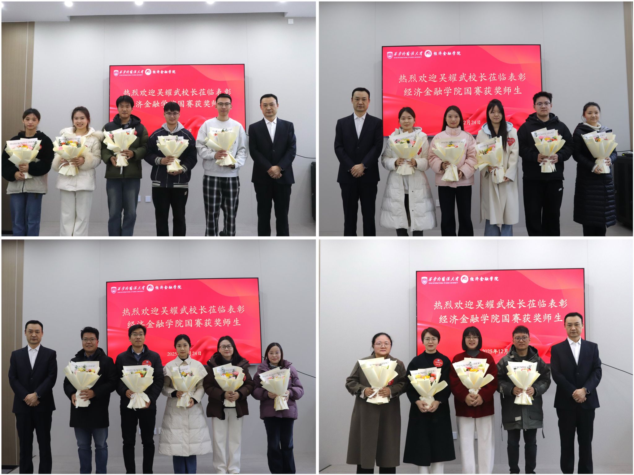 随后,吴耀武校长为获奖师生代表献花,并对大家在国家级学科竞赛中取得的优异成绩表示热烈祝贺,对指导教师的辛勤付出给予高度肯定。在总结讲话中,吴校长结合自身成长经历,分享了对学科竞赛育人价值的深刻认识。他以自己参与数理竞赛的经历为例,指出明确目标、科学方法和持之以恒的竞赛精神,对学生未来成长成才具有重要促进作用。吴校长表示,学校高度关注在学科竞赛中表现突出的学生群体以及具有奉献精神的学生干部,希望KU体育 学子充分发挥外语院校特色优势,推动语言能力与专业知识深度融合,不断拓展发展空间,在服务国家和社会发展中实现更大作为。