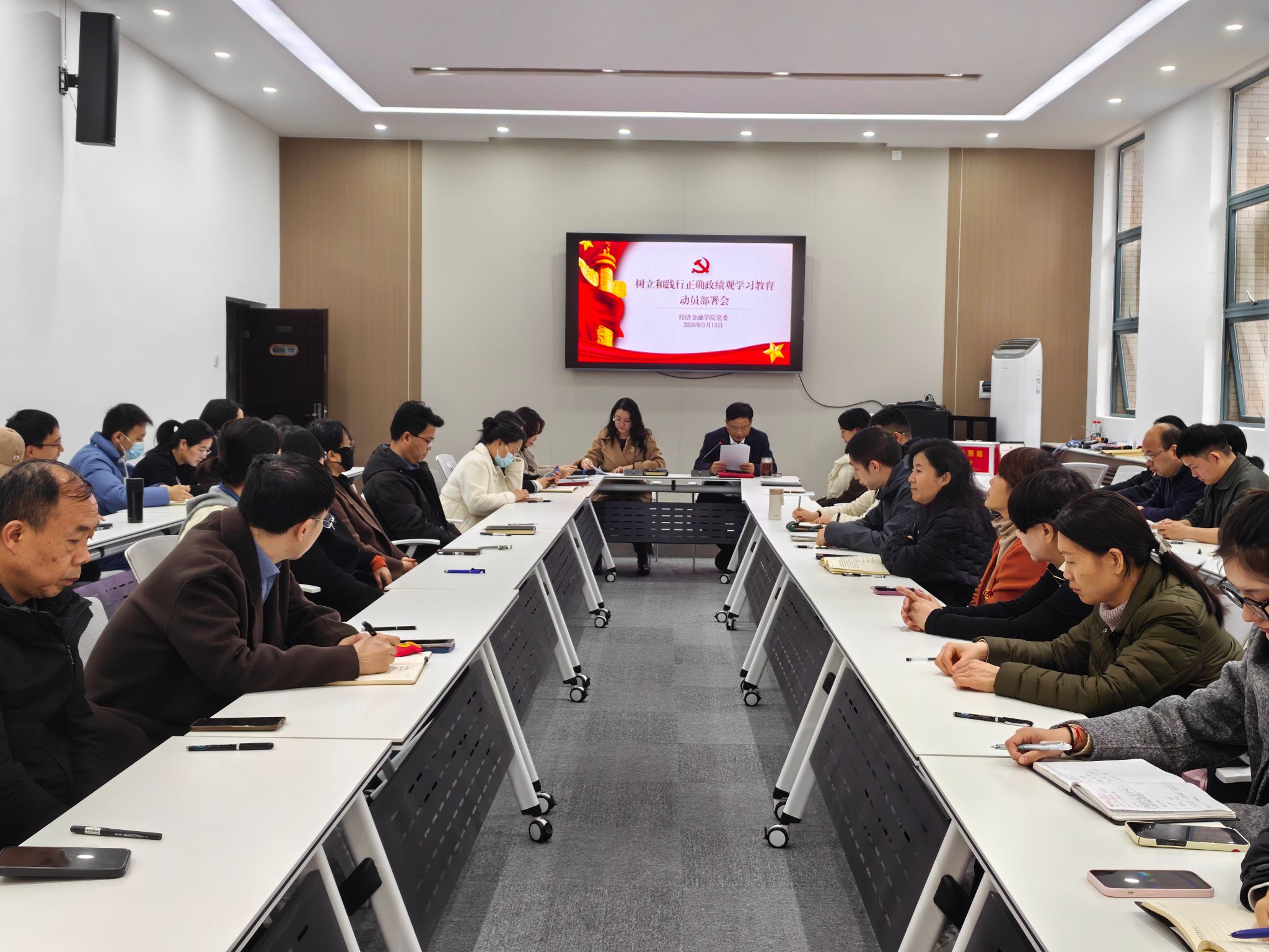 3月13日,KU体育 在H106会议室召开树立和践行正确政绩观学习教育动员部署会暨党委理论学习中心组(扩大)会议,深入学习贯彻习近平总书记关于树立和践行正确政绩观的重要论述,传达中省和学校党委相关会议及文件精神。KU体育 全体教职工参加会议,会议由KU体育 党委书记邓雯主持。