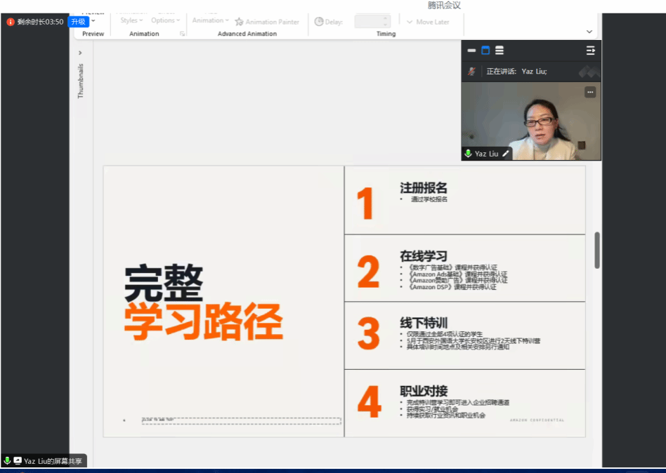 随后,刘雅卓从项目背景与价值、学习路径、重要时间节点、职业发展机会和行动计划五个方面,对定制班项目进行了系统解读。在学习路径方面,她重点介绍了项目涵盖的《亚马逊广告基础》《亚马逊 SP》《亚马逊 DSP》《亚马逊 AMC》等专业认证体系;在职业发展方面,她结合行业发展趋势,介绍了项目提供的企业实习、就业资源对接等支持,为同学们勾勒了数字广告领域的职业发展方向,并明确了项目各阶段的时间安排与参与计划。
