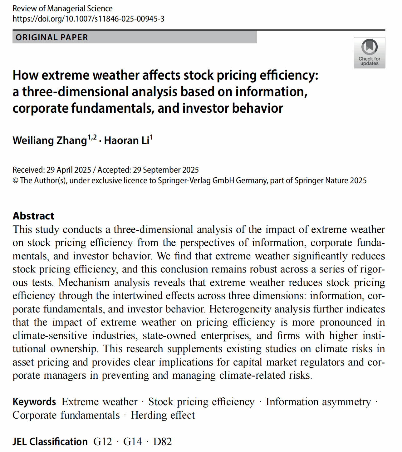 近日,KU体育 张伟亮副教授和研究生李昊然在“Review of Managerial Science”(ISSN:1863-6683)期刊,发表最新研究成果“How extreme weather affects stock pricing efficiency: a three-dimensional analysis based on information, corporate fundamentals, and investor behavior”。该期刊为工商管理领域所有科学方向的创新性研究提供交流平台,发表高质量原创研究,且接受多种研究方法(包括分析建模、实证研究、实验研究、方法论证等),涵盖范围包括但不限于以下领域:会计学、审计学、银行业、企业战略、公司治理、创业学、财务结构与资本市场、健康经济学、人力资源管理、信息系统、创新管理、保险学、市场营销、组织管理、生产与物流、风险管理及税收学。目前,该期刊为SSCI JCR一区期刊,影响因子9.6。