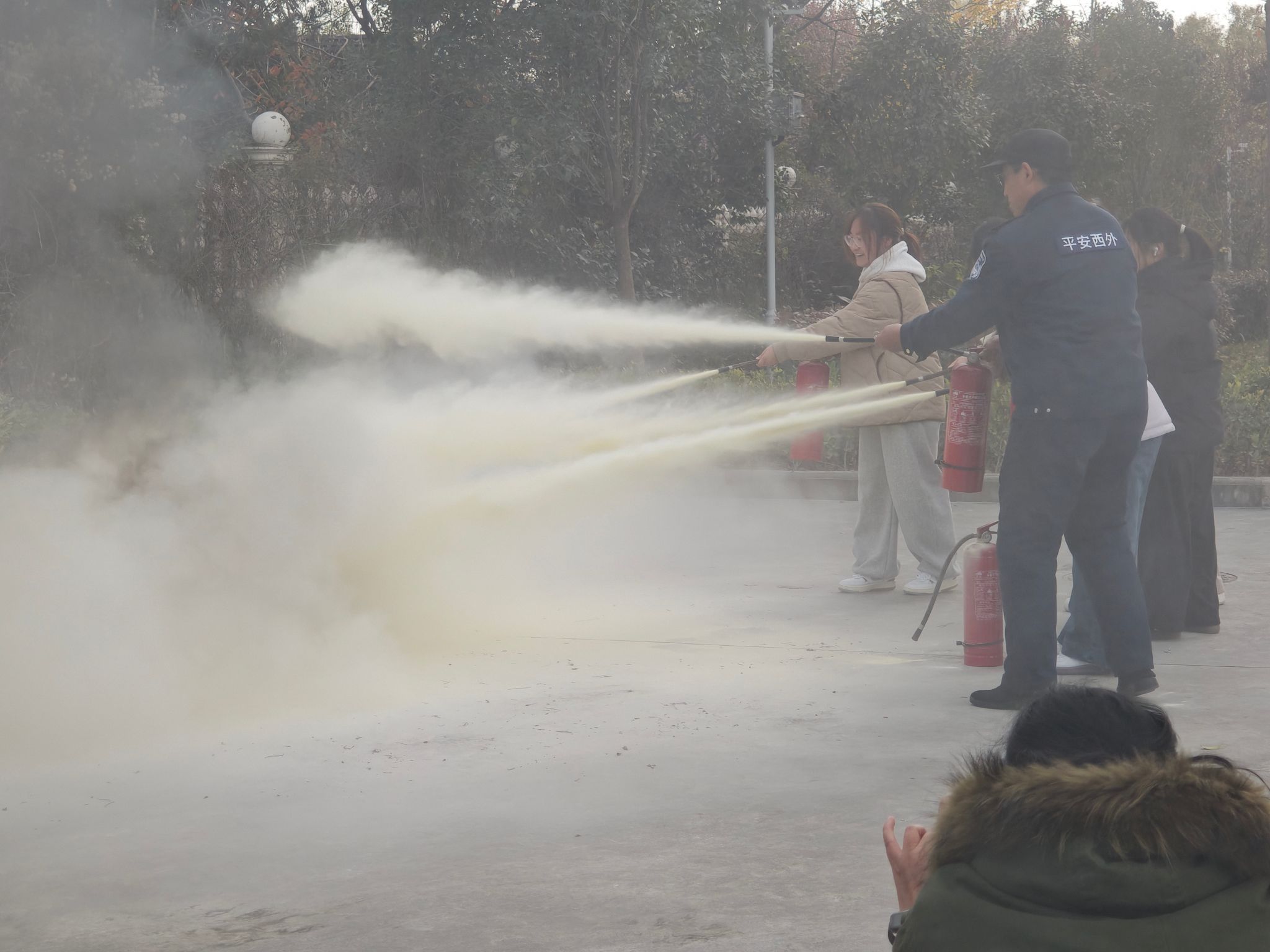 顺利完成疏散演练后,张立军老师结合校园典型火灾案例,重点讲解了干粉灭火器的使用原理与操作要领,通过“提、拔、握、压”四字口诀的精炼概括,配合现场演示,使同学们系统性掌握了扑救初起火灾的“关键一招”。